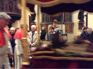 Assisi, 19 aprile 2014: grande afflusso turistico per Pasqua (confermato da trivago.it che indica Assisi come meta italiana più richiesta del periodo), sottolinea il Sindaco Claudio Ricci, con ampia partecipazione anche alle cerimonie religiose (foto, ieri sera, della processione del Cristo morto, “in movimento”, verso la Cattedrale di San Rufino). Peraltro é stata aperta, in questi giorni, la mostra sui 48 frammenti artistici del muro di Berlino, a Palazzo Monte Frumentario sino al 10 settembre 2014.