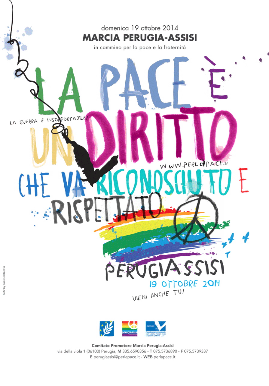 Per questo, domenica 19 ottobre 2014 si svolgerà una nuova grande Marcia per la pace da Perugia ad Assisi. Migliaia di persone, famiglie, scuole, associazioni ed Enti Locali si metteranno in cammino contro tutte le guerre, quelle fatte di tagliagole, di bombardamenti e quelle “meno visibili, ma non meno crudeli, che si combattono in campo economico e finanziario con mezzi altrettanto distruttivi di vite, di famiglie, di imprese.”