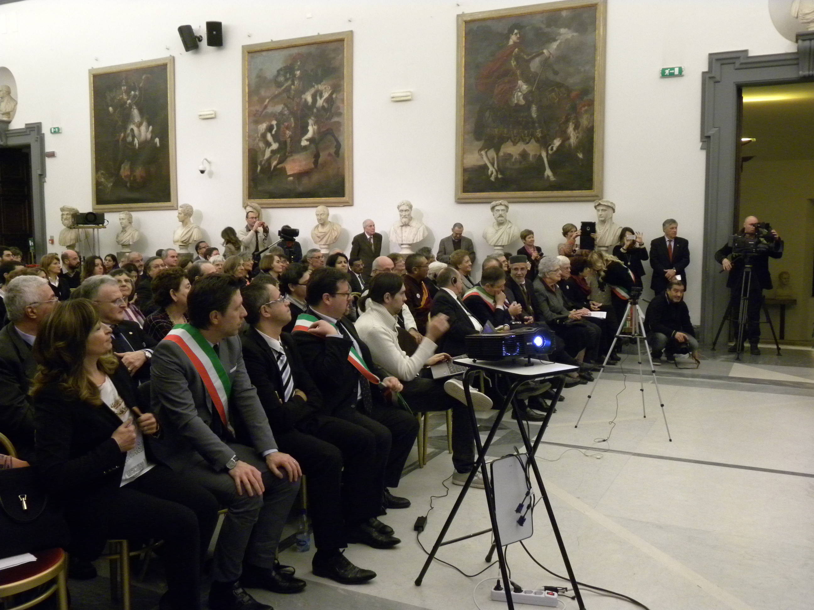 Nel corso della cerimonia hanno preso la parola l’assessore Paolo Masini del Comune di Roma, delegato al dialogo interreligioso, che ha portato il saluto del sindaco Ignazio Marino; la dott.ssa Donatella Tesei, Sindaco di Montefalco e Vice Presidente dell’Associazione “Città per la Fraternità”, la quale ha sottolineato il valore dell’iniziativa che tende ad instaurare un modello positivo nelle amministrazioni comunali; il dott. Antonio Baldaccini, Amministratore Delegato della “Umbra Group”, il cui intervento ha suscitato un caloroso applauso rivelando come gli ideali del padre siano stati fatti propri dai suoi tre figli.