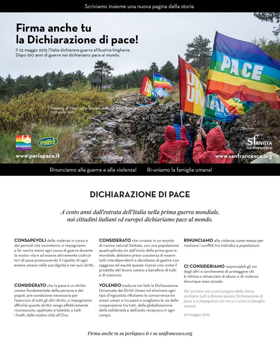 Dopo cento anni di guerre, scrivono Flavio Lotti della Tavola della pace e p. Enzo Fortunato della Rivista “San Francesco” del Sacro Convento di Assisi, noi cittadini italiani ed europei, consapevoli delle violenze in corso e dei pericoli che incombono, dobbiamo impegnarci a scrivere una pagina nuova nella storia. Con questo spirito invitiamo tutti a firmare una Dichiarazione di pace!”
