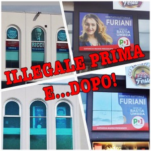 Dopo la denuncia del 16/5/2015 ad opera del MoVimento 5 Stelle di Bastia Umbra per la mancata rimozione dei manifesti elettorali illegali, il candidato Presidente della Regione Claudio Ricci sposta di un metro i manifesti mettendoli in penombra dopo averli furbescamente ed illecitamente esposti dalle vetrate di un capannone ben visibile dalla antistante SS75 in località Bastia, mentre la candidata consigliera regionale Ramona Furiani rimuove solo parzialmente la sua affissione oggetto di contestazione, dimostrando di aver gia ben appreso la recente lezione impartita dal suo segretario nazionale, con la quale si afferma il principio per cui le regole vanno rispettate solo parzialmente (vedi sentenza rimborsi ai pensionati): come per l’omeopatia, la legge va assunta a piccole dosi, per non creare dipendenza!