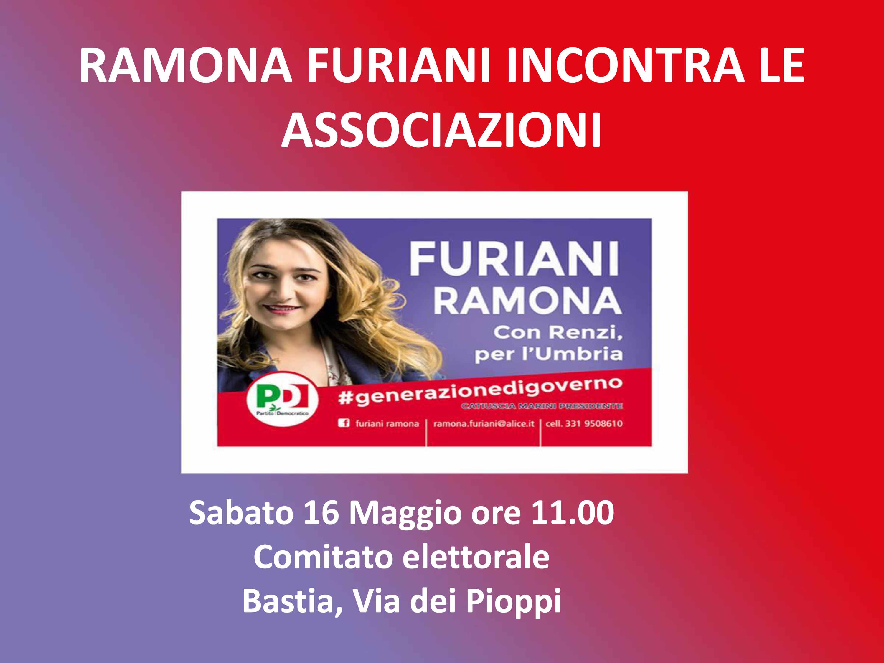 Ramona Furiani, Candidata Consigliere Regionale della lista PD, invita le associazioni culturali e sociali ad un incontro che si terrà Sabato 16 Maggio ore 11.00 presso il Comitato elettorale (Bastia Umbra, Via dei Pioppi). L’incontro, oltre alla reciproca conoscenza, ha anche lo scopo principale di ascoltare per raccogliere suggerimenti, indicazioni e proposte sui bisogni e sulle linee di azione che si ritengono prioritarie per il futuro.