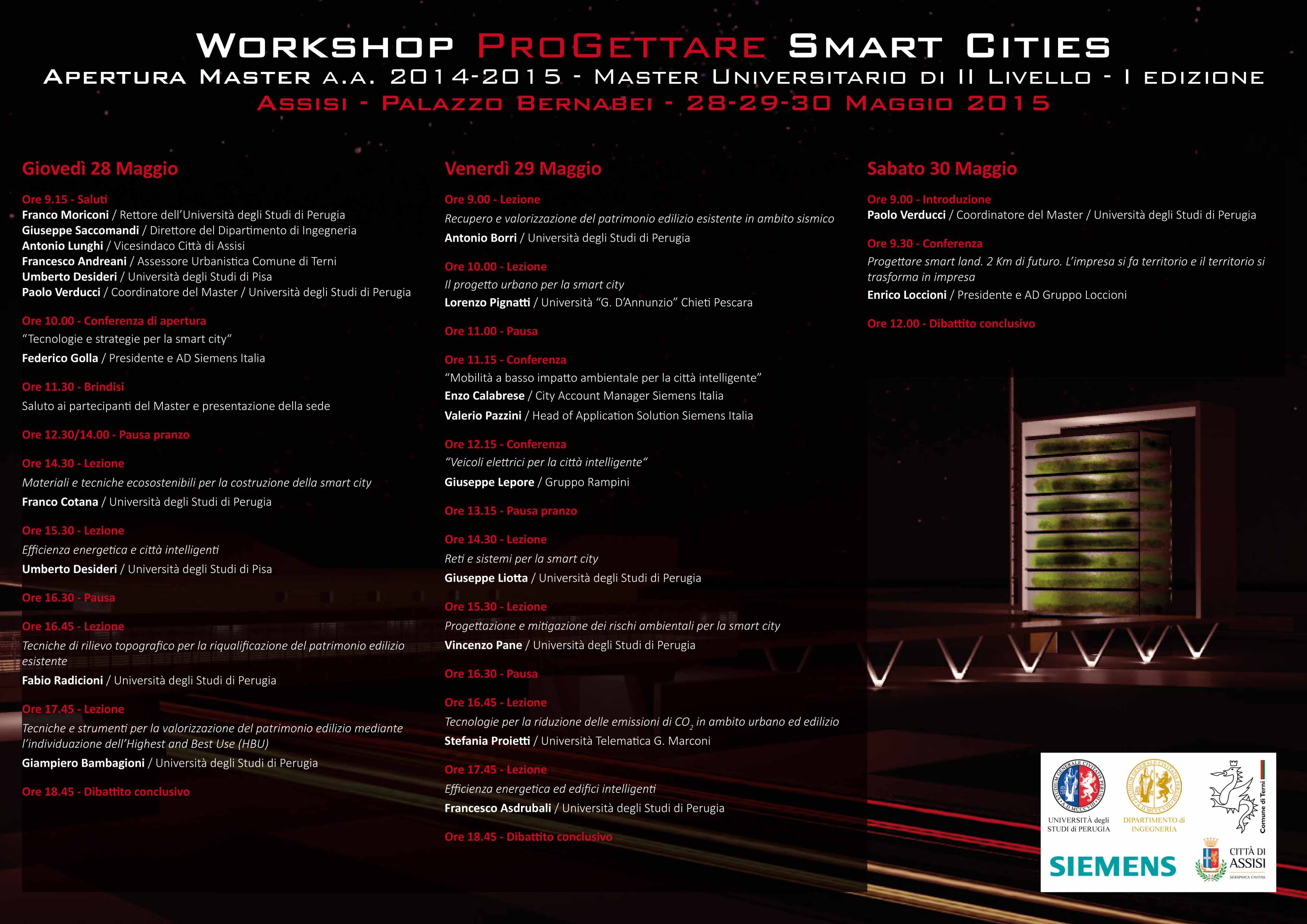 Venerdì 29 maggio la giornata si aprirà con l’intervento di Antonio Borri dell’Università degli Studi di Perugia che affronterà il tema del recupero e valorizzazione del patrimonio edilizio in ambito sismico. A seguire Lorenzo Pignatti dell’Università G.D’Annunzio Chieti-Pescara parlerà dello spazio urbano e del ruolo del progetto d’architettura in una logica smart city. Nella seconda parte della mattinata sarà affrontato il tema della mobilità a basso ambientale con tre interventi specifici di area Siemens. Ambedue gli interventi, tenuti rispettivamente da Valerio Pazzini, Head of Application Solutions Siemens Italia e da Giuseppe Lepore del Gruppo Rampini, verranno introdotti ed integrati da Enzo Calabrese, City Account Manager Siemens Italia. Dopo la pausa pranzo, il lavori riprenderanno alle ore 14.30 con quattro lezioni che affronteranno il tema dell’ICT in ambiti urbani ed extraurbani, la mitigazione dei rischi ambientali con particolare attenzione alla prevenzione, la riduzione delle emissioni e dell’efficienza energetica di strutture urbane complesse e il recupero di ex aree industriali, tenute rispettivamente da Giuseppe Liotta, docente dell’Università degli Studi di Perugia e delegato del Rettore per il settore dell’informatizzazione, agenda digitale e I.C.T., da Vincenzo Pane dell’Università degli Studi di Perugia, da Stefania Proietti, dell’Università Telematica ‘G. Marconi’ e da Francesco Asdrubali dell’Università degli Studi di Perugia.