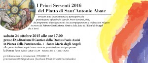 Sabato 24 ottobre, alle ore 17.00 presso l’Auditorium Il Cantico della Domus Pacis a Santa Maria degli Angeli di Assisi, i Priori Serventi 2016 (Gianni Beddini, Francesco Campelli, Andrea Capezzali, Gianluca Cappelletti, Gianluca Cassoni, Giuseppe Dionigi, Marco Dusi, Mauro Lepore, Giampiero Mencarelli, Stefano Minciarelli, Fabrizio Serena Fernando Sante e Vasco Trippetta) presentano ufficialmente il programma dei festeggiamenti che accompagnano le celebrazioni religiose in onore di Sant’Antonio Abate, patrono di Santa Maria degli Angeli.