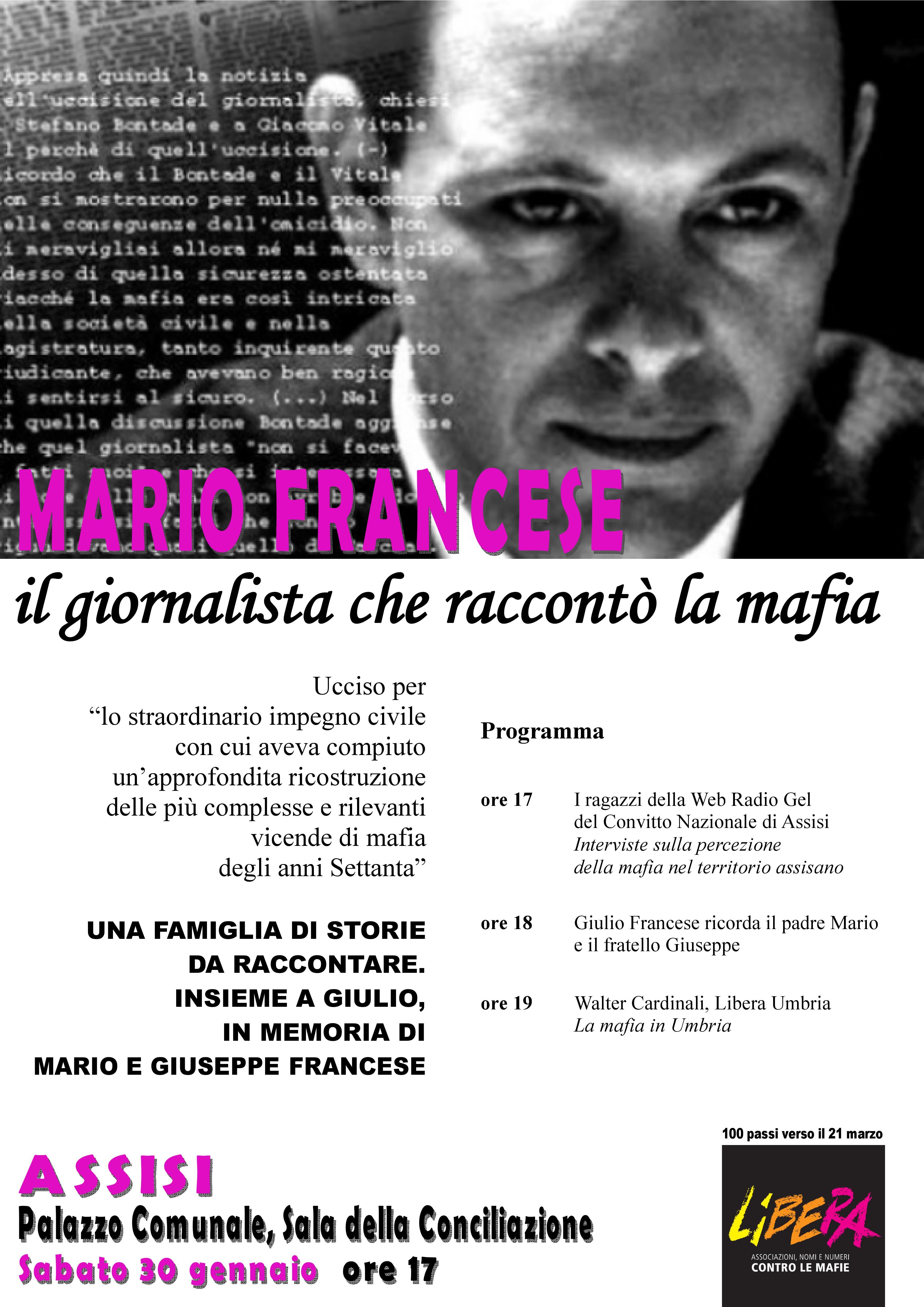 Un professionista estraneo a qualsiasi condizionamento, privo di ogni compiacenza verso i gruppi di potere collusi con la mafia e capace di fornire all’opinione pubblica importanti strumenti di analisi dei mutamenti in atto all’interno di Cosa Nostra: questo era Mario Francese, cronista di “nera” del Giornale di Sicilia che fu ucciso dalla mafia a Palermo il 26 gennaio 1979 e a cui è dedicato il Presidio Libera Valle Umbra.