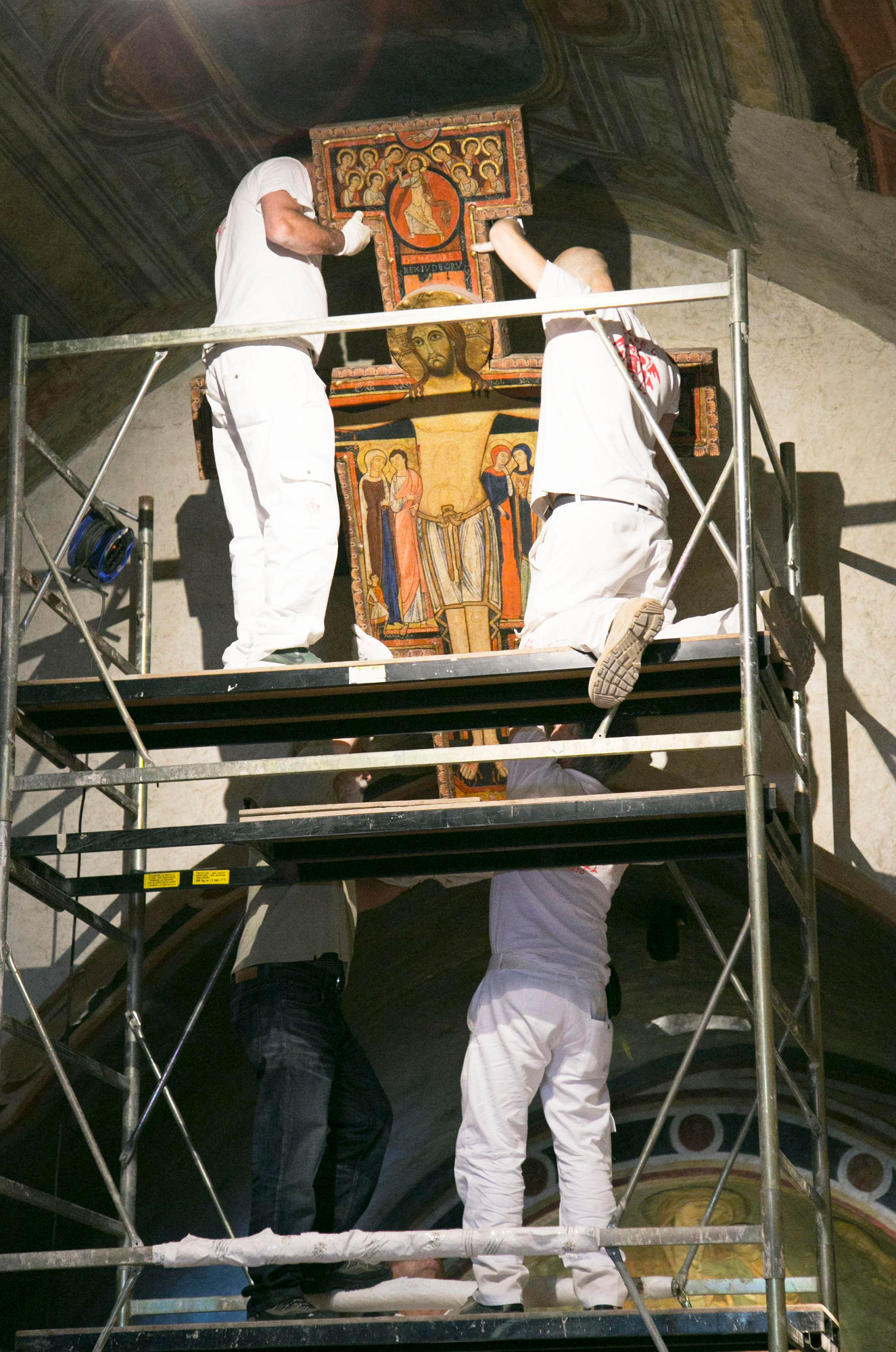 Alle 9.00 di questa mattina l’originale dell’icona del Crocifisso più diffusa al mondo è stata deposta dalla collocazione che ha avuto negli ultimi 750 anni circa, ovvero la Cappella del Crocifisso nella Basilica di Santa Chiara in Assisi. Dopo un breve momento di preghiera e di venerazione, riservato alle Sorelle Clarisse, l’attesa traslazione verso il luogo in cui “incontrò” Francesco di Bernardone. Lui, giovane semplicemente in ricerca come tanti, ne fu conquistato al punto da non avere più dubbi che di quel Dio Amore ci si può fidare. Per questo non esita a far suo, con letizia, l’incarico ricevuto: “Francesco, va e ripara la mia casa, che cade in rovina”.