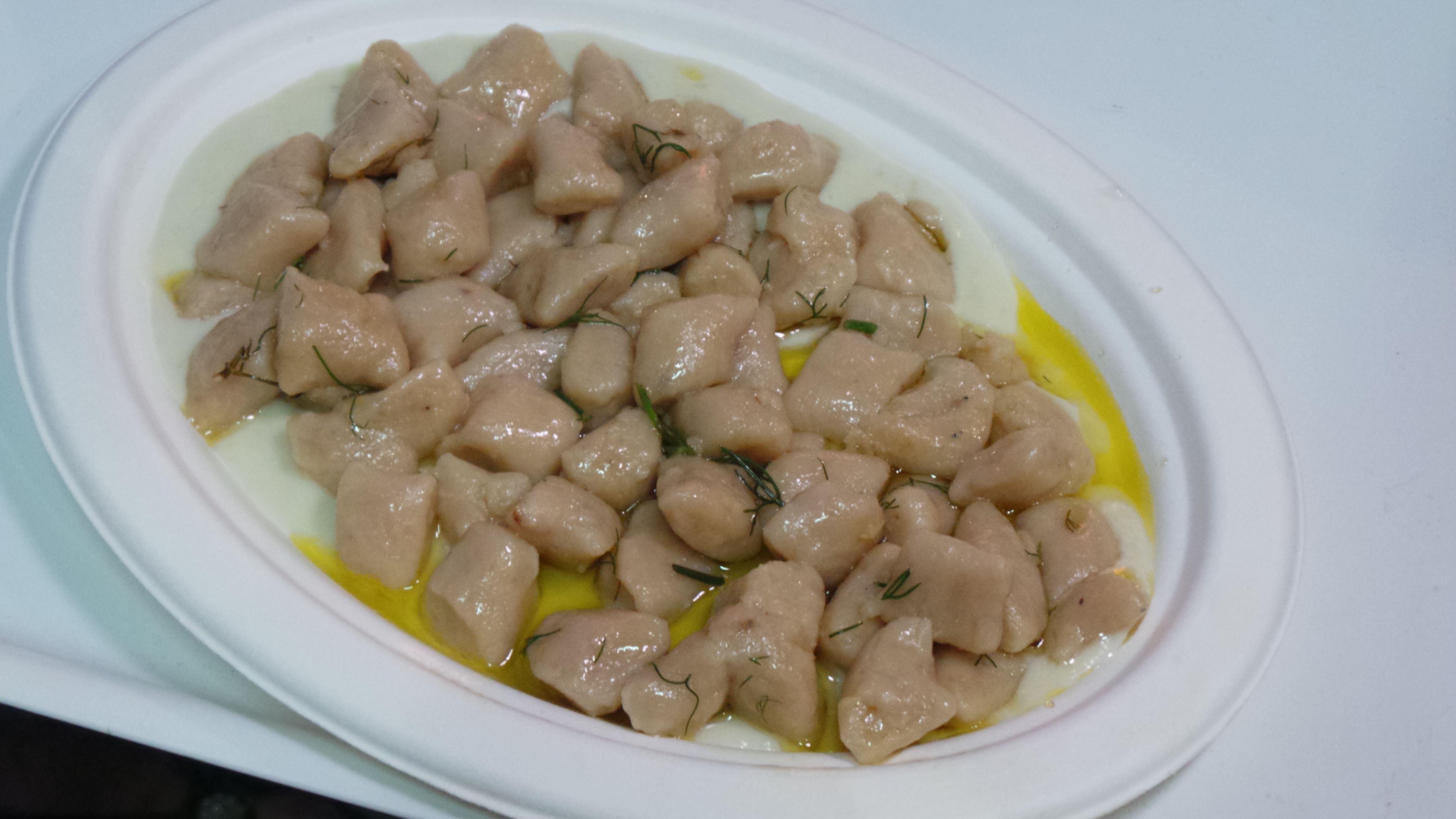 Spieghiamo ora come si realizza lo gnocco del porchettaio. Si impastano le patate con la porchetta tritata e la farina. Il tutto è poi condito con una salsa, fatta di olio, aneto fresco tagliuzzato, una vellutata di finocchi cotti al vapore ed emulsionati in una crema di latte. Una procedura che ormai le donne gnoccare sanno fare con molta abilità.