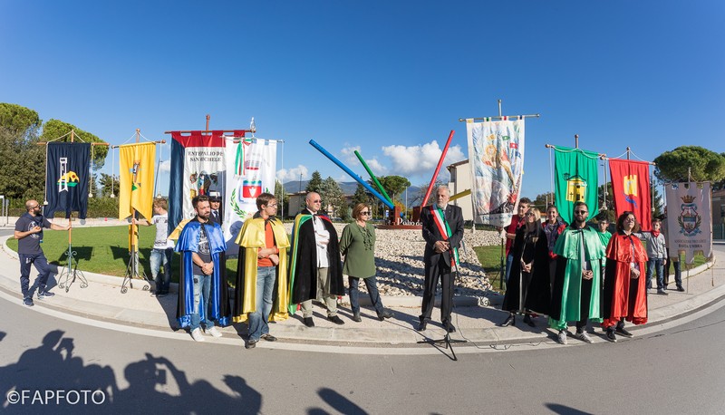 Domenica 16 ottobre alle ore 15.30 si è svolta la cerimonia inaugurale della Rotatoria stradale di Via Roma e dell’arredo della rotonda. L’opera è molto importante per la città di Bastia Umbra e per la sua storia recente, in quanto il tema illustrato dall’arredo si ispira al Palio di San Michele Arcangelo. L’arredo è stato progettato dall’Architetto Gianluca Falcinelli che ha diretto anche i lavori relativi all’arredo della Rotonda. Quest’ultimo, profondo conoscitore delle vicende e della storia del Palio (nonché ex Presidente dell’Ente Palio, ndr) durante la cerimonia d’inaugurazione, ha illustrato alcuni dettagli significativi legati alla storia di Bastia e della festa patronale. Numerosa la cittadinanza intervenuta per condividere questo momento di festa. Presenti i rappresentanti istituzionali dell’Amministrazione Comunale e dell’Ente Palio con i Capitani dei 4 Rioni, della Parrocchia e della Pro Loco di Bastia Umbra.