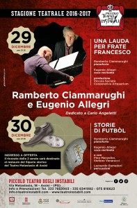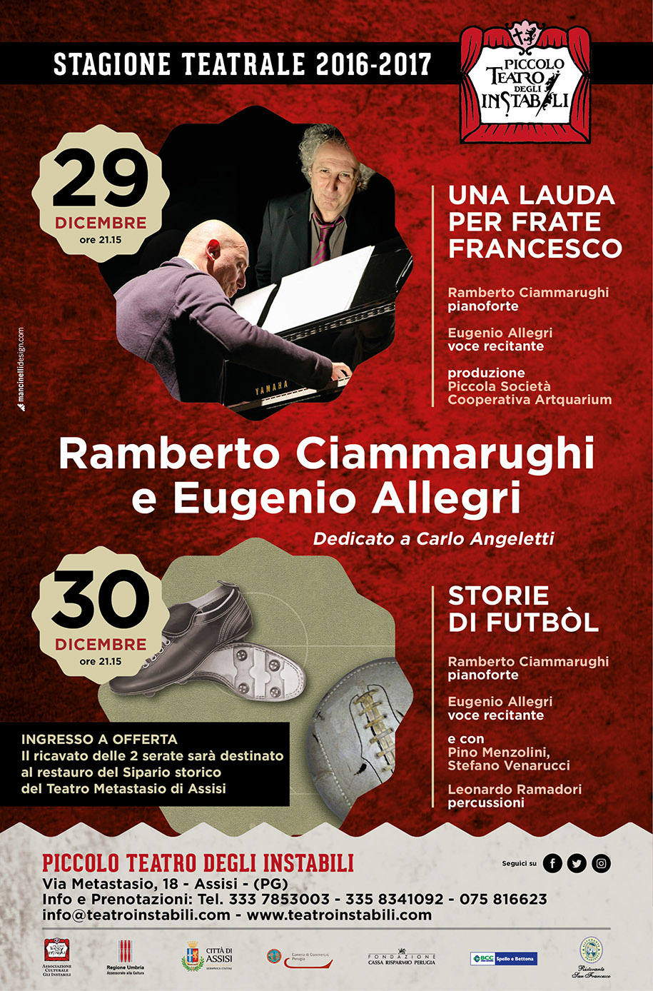 Il 30 dicembre si narrano invece “Storie di Futbol” ,un racconto di calcio e di calciatori, per amanti e non, che vedrà protagonisti Eugenio Allegri, Pino Menzolini e Stefano Venarucci accompagnati al pianoforte da Ramberto Ciammarughi e alle percussioni da Leonardo Ramadori.