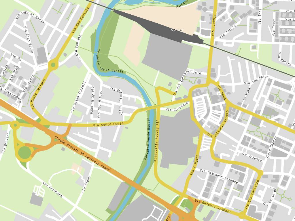 Quanto al by-pass fra la strada assisana e la SS 75, in prossimità del confine orientale con il Comune di Assisi, si propongono due possibili soluzioni, in alternativa: 1) una variante prossima ai tessuti urbanizzati esistenti del capoluogo, riprendendo nella sostanza una previsione del PRG vigente; 2) una soluzione più esterna e vicina al confine comunale, da verificare e coordinare fra le due Amministrazioni locali. La realizzazione del by-pass sarà l’occasione di progettare e realizzare il corridoio ambientale (una significativa discontinuità verde), prevista dal Documento programmatico fra i tessuti urbanizzati di Bastia e Santa Maria degli Angeli: un pezzo significativo della rete ecologica e ambientale locale.