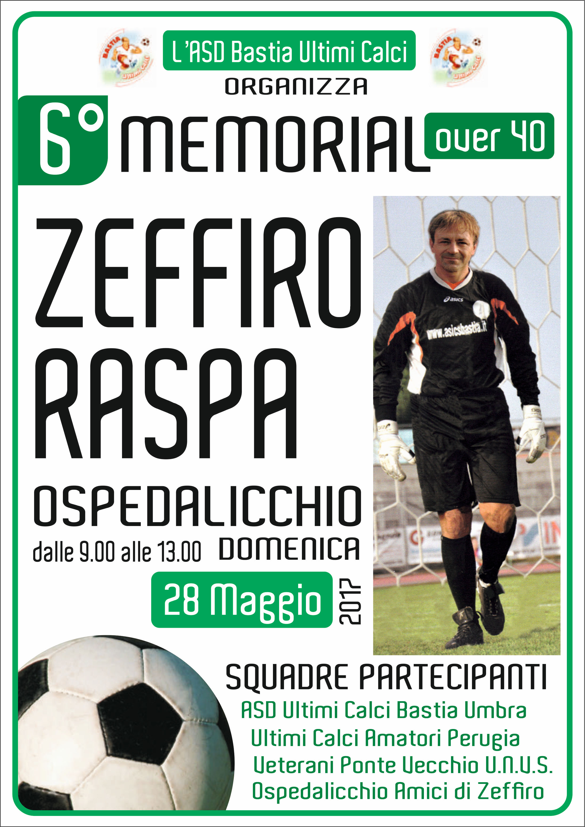 Il Memorial Zeffiro Raspa 2017 si svolgerà domenica mattina 28 maggio a partire dalle ore 9 presso il campo sportivo di Ospedalicchio organizzato da 6 anni con squadre umbre over 40. Quest’anno quelle partecipanti sono: Ultimi Calci Amatori Perugia, Veterani Ponte Vecchio U.N.V.S., Amici di Zeffiro ed ovviamente l’A.S.D. Ultimi Calci Bastia Umbra.