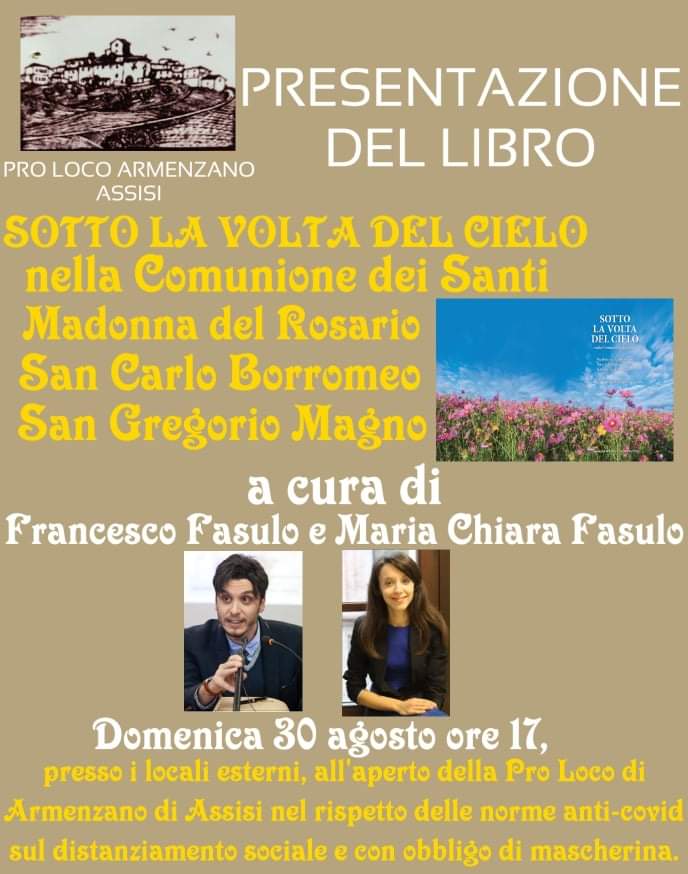Domenica 30 agosto alle ore 17:00 presso la Pro Loco di Armenzano di Assisi, si svolgerà la presentazione del libro “SOTTO LA VOLTA DEL CIELO nella Comunione dei Santi – Madonna del Rosario, San Carlo Borromeo, San Gregorio Magno”, a cura di Francesco Fasulo e Maria Chiara Fasulo. La nostra opera, spiegano i due autori, “tra storia, cultura, arte e spiritualità ha l’obiettivo di sensibilizzare e dare consapevolezza alle persone del nostro territorio comunale assisano su testimoni di vita evangelica come la Madonna del Rosario, San Carlo Borromeo e San Gregorio Magno che hanno vissuto la loro esistenza con amore, misericordia, semplicità, umiltà e attenzione al prossimo.”  La Prefazione è stata curata da padre Michele Giura, già parroco di Torchiagina e San Gregorio e l’Introduzione: Il “Patrocinio” dei Santi da padre Luigi Marioli, frate conventuale, critico d’arte e già direttore del Museo del Tesoro della Basilica Papale di San Francesco in Assisi. Lo studio e la ricerca metodica e scrupolosa dei fratelli Fasulo, afferma padre Michele,“ci mette tra le mani altre novità, altra storia cui la comunità di tutto il territorio comunale assisano o di chiunque verrà in possesso di questo pregiato lavoro, potrà attingere o riferirsi.”