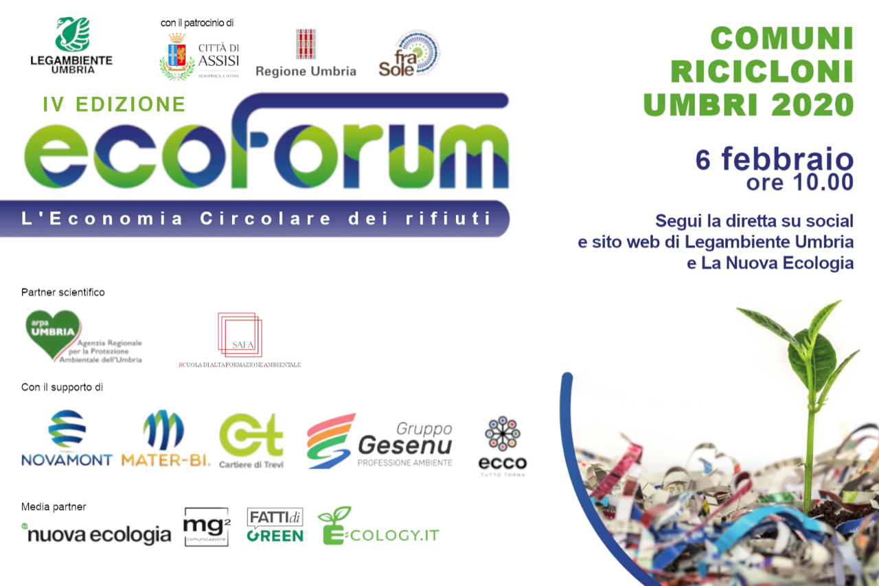 L’Ecoforum (sabato 6 febbraio dalle 10), è promosso da Legambiente Umbria, in collaborazione con Arpa Umbria, con il patrocinio di Regione Umbria, Comune di Assisi e il supporto di Gesenu, Cartiere di Trevi, Novamont e il Progetto ECCO. Durante la giornata di sabato ci sarà la presentazione del Rapporto Comuni Ricicloni 2020, e la successiva premiazione con la consegna “virtuale” degli attestati ai comuni Ricicloni umbri vincitori. Prevista anche una sessione con l’intervento di Massimo Pera sulle azioni messe in campo da Gesenu finalizzate ad un profonda revisione della gestione integrata dei rifiuti.