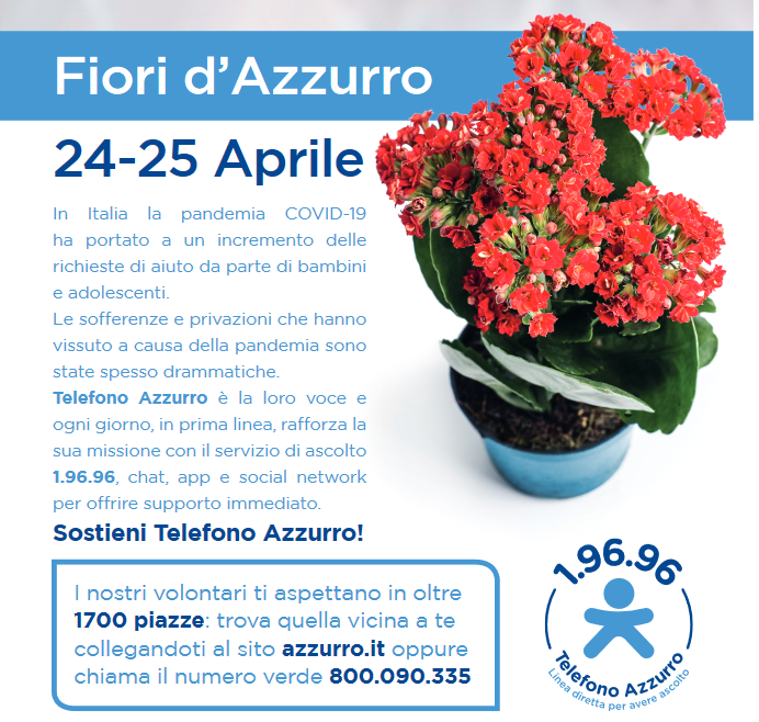 Il Comune di Bastia Umbra ha aderito alla manifestazione solidale di Telefono azzurro che si svolge su oltre 1700 città italiane, prevista per sabato 24  e domenica 25 aprile 2021. Con un fiore possiamo aiutare ed essere vicini ai bambini e agli adolescenti  in difficoltà e  condividere un messaggio di speranza. Sosteniamo insieme la campagna solidale di raccolta fondi di Telefono Azzurro, con l’acquisto di una piantina di Calancola, allegra, colorata, vivace come il sorriso di un bambino.