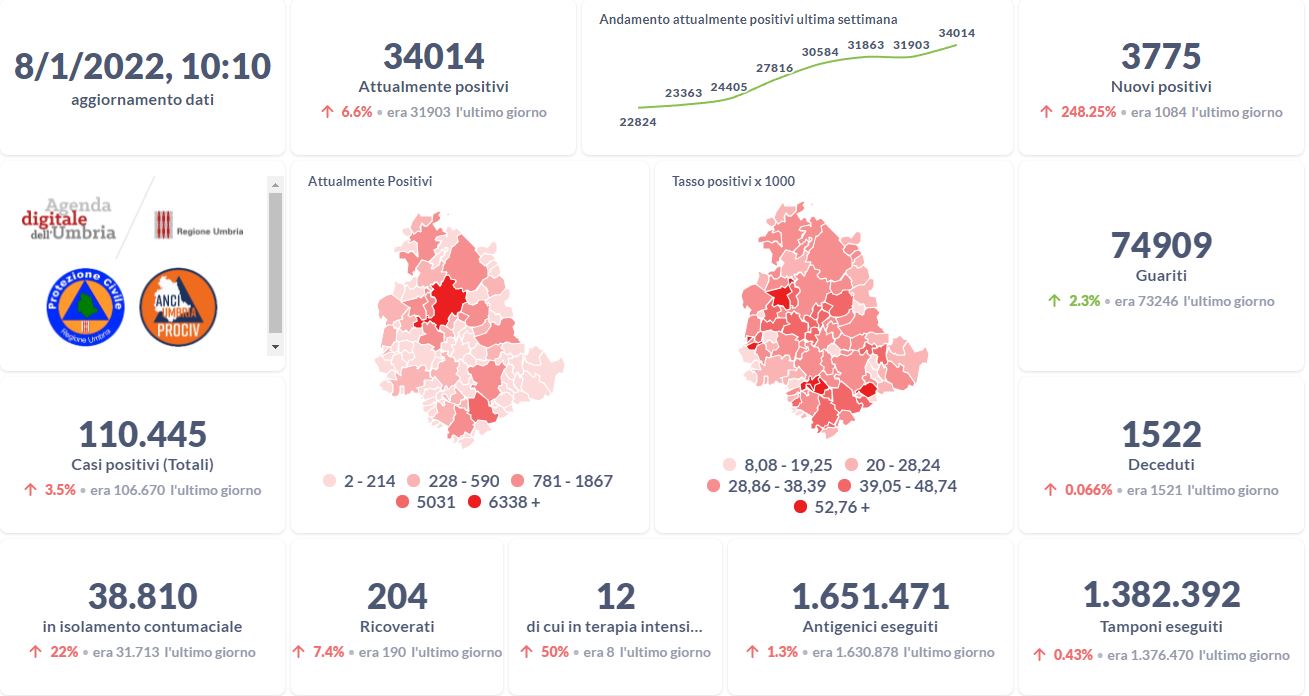 Dai dati aggiornati alle ore 10:10 di oggi 8 gennaio, 110.445 persone in Umbria risultano in totale positive al virus (+3.775 rispetto a ieri), gli attualmente positivi sono 34.014 (+2.111 rispetto a ieri), i guariti sono 74.909 (+1.663 rispetto a ieri).