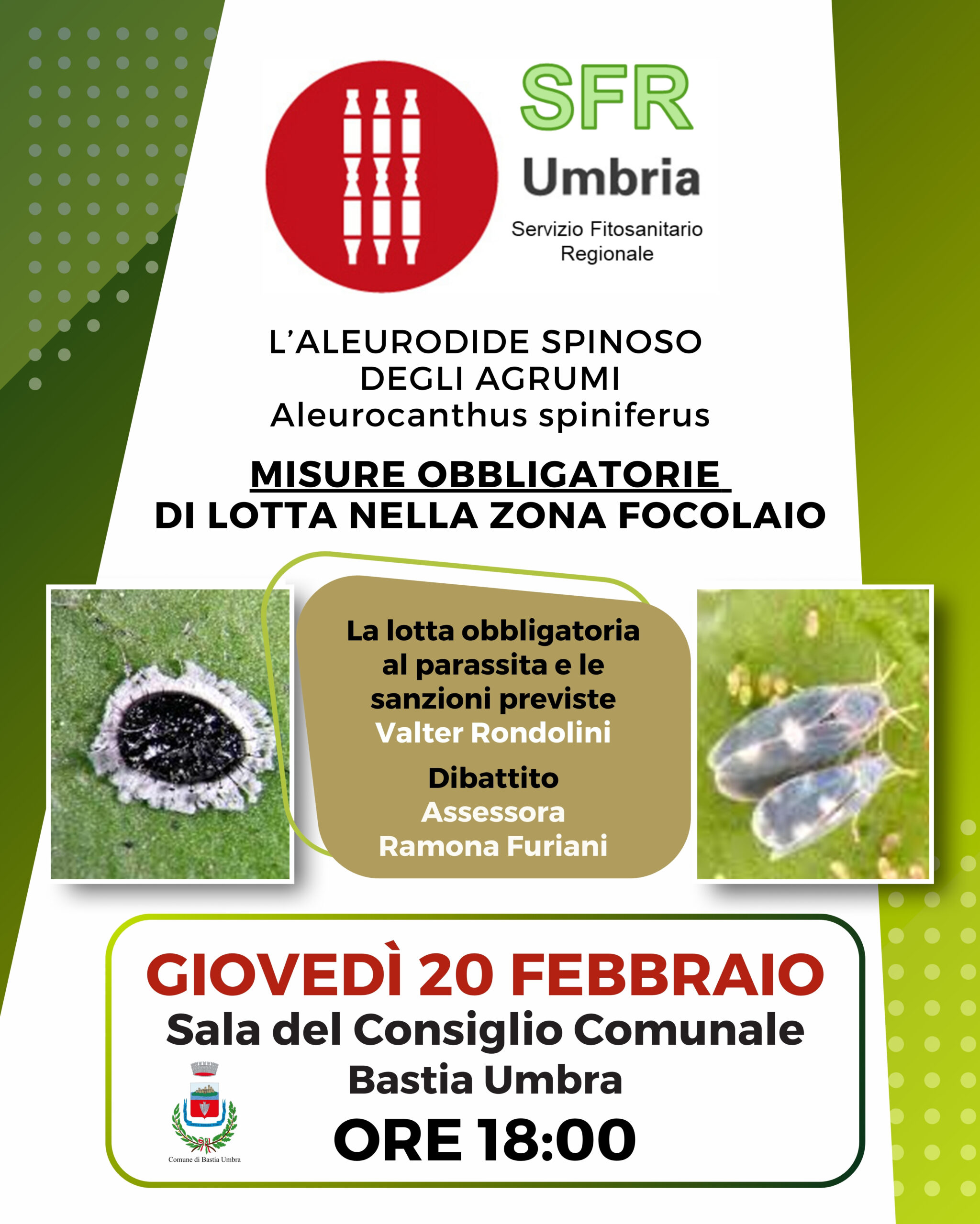 Bastia Umbra, 13/02/2025 – Si comunica ai cittadini che Giovedì 20 Febbraio 2025 alle ore 18:00, presso la Sala del Consiglio Comunale di Bastia Umbra, si terrà un incontro informativo sulla lotta obbligatoria al parassita Aleurocanthus spiniferus, Aleurodide spinoso degli agrumi.