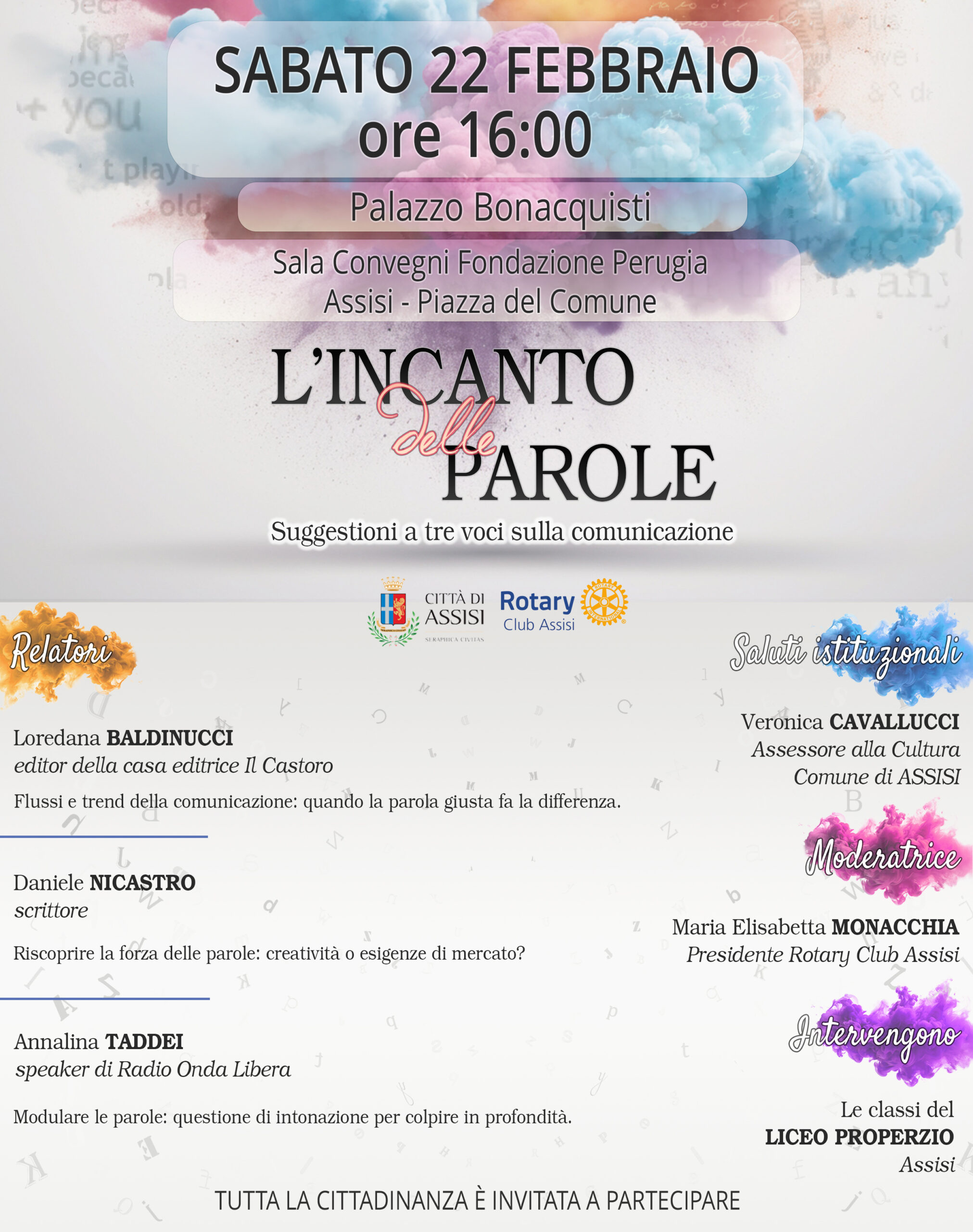 Assisi, 19/02/2025 – Scrittori, editor e speaker radiofonici a confronto ad Assisi su suggestione e fascino delle parole, in un’epoca in cui queste sembrano aver perso forza a vantaggio delle immagini, ma in realtà conservano un potere e un valore che trascende spazio e tempo. L’evento – aperto a tutti e intitolato “L’incanto delle parole” – si terrà sabato 22 febbraio 2025, alle ore 16, nella sala convegni della Fondazione Perugia, a Palazzo Bonacquisti, in piazza del Comune. È promosso dal Rotary Club Assisi, in collaborazione con il Comune di Assisi. Interverrà l’assessore alla cultura Veronica Cavallucci e parteciperanno alcune classi del Liceo Properzio della città. Modererà l’incontro Maria Elisabetta Monacchia, presidente del Rotary Club di Assisi.