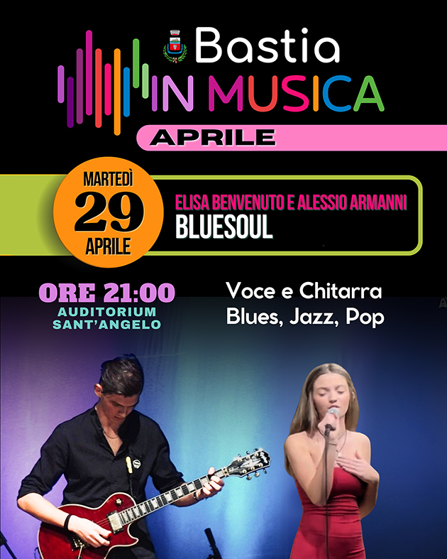 Il duo Bluesoul composto da Alessio Armanni ed Elisa Benvenuto vi aspettano per una serata di emozioni e momenti unici fra le sonorità del Blues, Jazz e Pop per farvi appassionare ad un tipo di musica che, al giorno d’oggi, è quasi del tutto sparito.