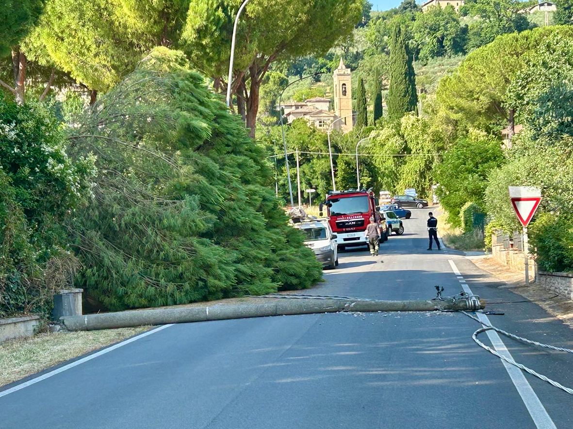 Tordibetto, 20/06/2025 – Un albero è caduto sulla strada a Tordibetto di Assisi e ha divelto un palo della fornitura di energia elettrica. È accaduto oggi pomeriggio, nel primo tratto di via Bastia, fortunatamente senza causare danni a persone o cose. Sul posto immediato l’intervento di Vigili del
