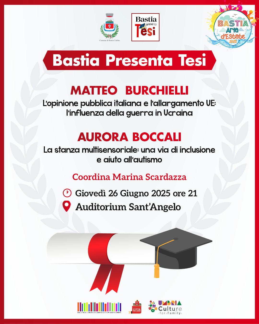 Bastia Umbra, 25/06/2025 – Nell’ambito del programma estivo “Bastia Aria d’Estate”, torna l’appuntamento con “Bastia Presenta Tesi”, il progetto culturale che mette al centro della vita collettiva il valore dello studio e della ricerca, offrendo uno spazio pubblico a chi desidera condividere il proprio lavoro accademico con la comunità. La serata di giovedì 26 giugno vedrà protagonisti: Matteo Burchielli, con la tesi “L’opinione pubblica italiana e l’allargamento UE: l’influenza della guerra in Ucraina” e Aurora Boccali, con “La stanza multisensoriale: una via di inclusione e aiuto all’autismo”.