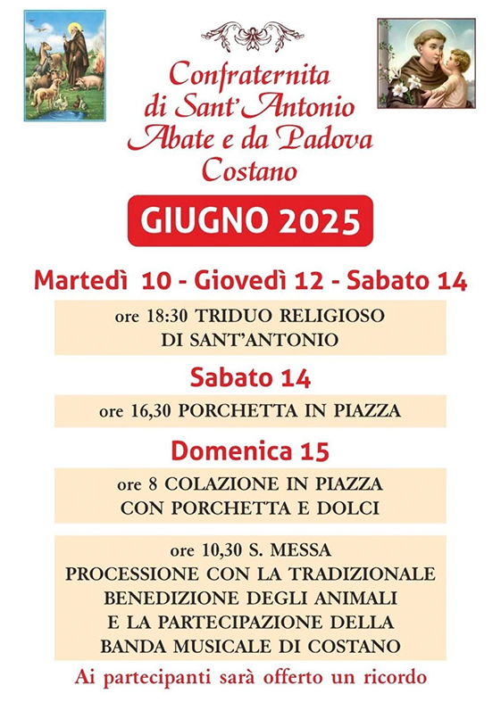 Tutti i cittadini e le cittadine sono invitati a partecipare a questa giornata di festa, storia del nostro territorio e tradizione, organizzata dalla Confraternita di Sant’Antonio di Costano.