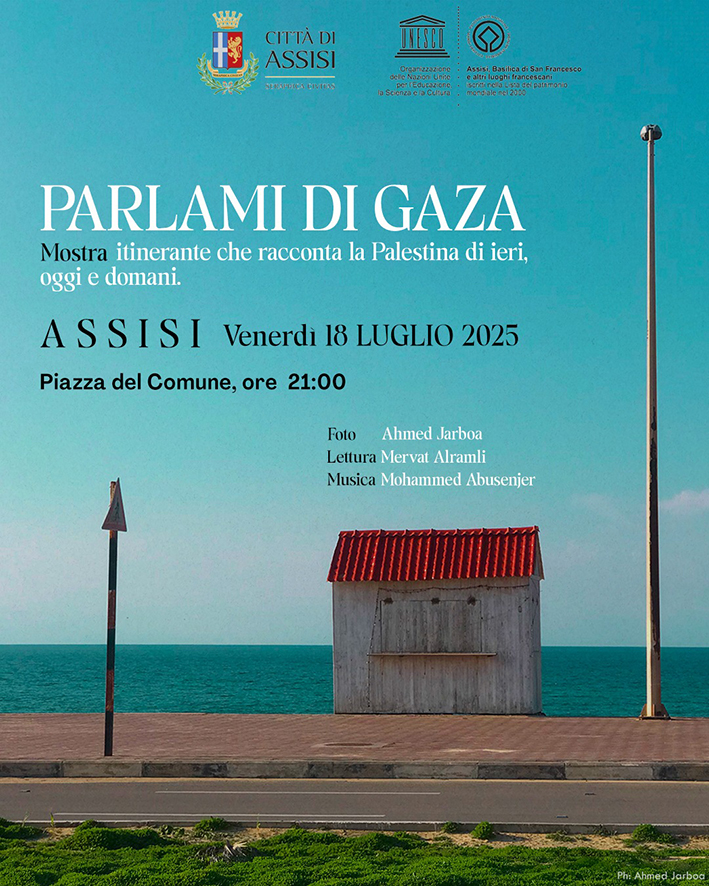 Assisi, 15/07/2025 – Assisi ospiterà la mostra itinerante “Parlami di Gaza”, messa in scena da tre artisti palestinesi sopravvissuti al conflitto in corso, con l’obiettivo di raccontare la Palestina di ieri, oggi e domani e la resilienza di un popolo devastato dalla guerra. L’evento si terrà venerdì 18 luglio prossimo, alle ore 21.00, in piazza del Comune. Si tratta di un reading musicale e fotografico, con letture ad alta voce, testimonianze, intermezzi sonori, immagini di luoghi e persone, che sta girando in varie parti d’Italia con l’obiettivo di accendere un faro sulle drammatiche condizioni di vita in Palestina, a causa del conflitto in atto.