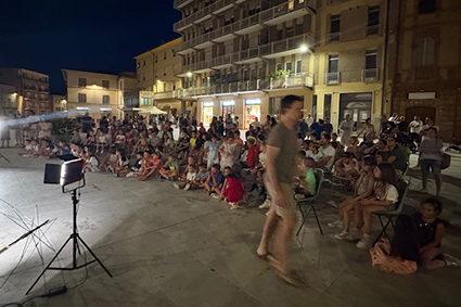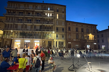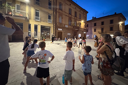 Ieri sera la piazza, per chi ha avuto la fortuna di esserci, era un giardino per bambini. È stata per esempio spiazzo per giocare a ruba fazzoletto, palcoscenico e platea di uno spettacolo teatrale e infine terreno di gioco di una caccia al tesoro tra le vie del centro storico.