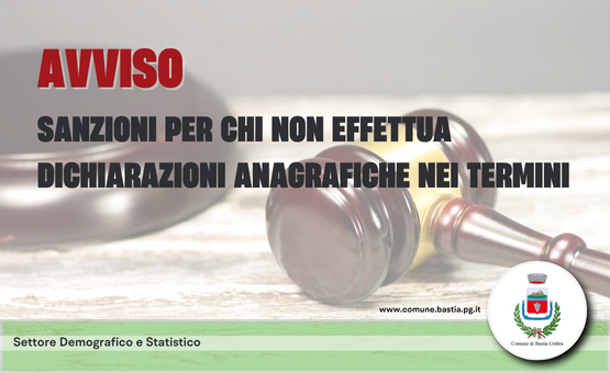 Il Settore Demografico del Comune di Bastia Umbra, a seguito della Delibera di Giunta n. 196 del 08.07.2025 è stato individuato, quale organizzazione funzionale al procedimento sanzionatorio in materia di dichiarazioni anagrafiche di cui all’oggetto, nella persona del Responsabile il quale, all’interno della struttura, ha attribuito, con apposita determinazione n. 578 del 15.07.2025 rispettivamente gli incarichi relativi alla fase di accertamento e di irrogazione delle sanzioni ed ha individuato criteri minimi per la quantificazione dell’importo dell’ammenda.