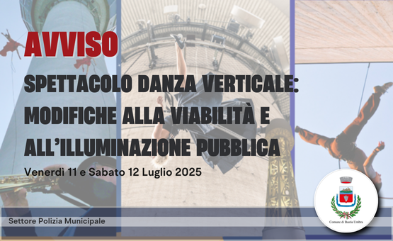 Bastia Umbra, 11/07/2025 – Si comunica ai cittadini che in occasione dello spettacolo di Danza Verticale della Compagnia “Il Posto”, che si terrà Sabato 12 Luglio 2025 presso il Conservone (Torre dell’Acqua) di Viale Umbria, verranno adottate modifiche alla viabilità per lo svolgimento della performance e la relativa preparazione degli artisti. Pertanto, verranno adottati i seguenti provvedimenti relativi alla viabilità nelle seguenti vie della Città: