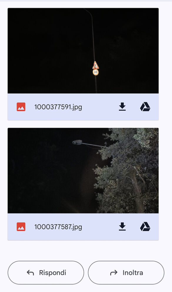 Sotto è possibile visionare le fotografie dei due punti luce spenti e la mail istituzionale inviata da Fasulo ad ENGIE.
