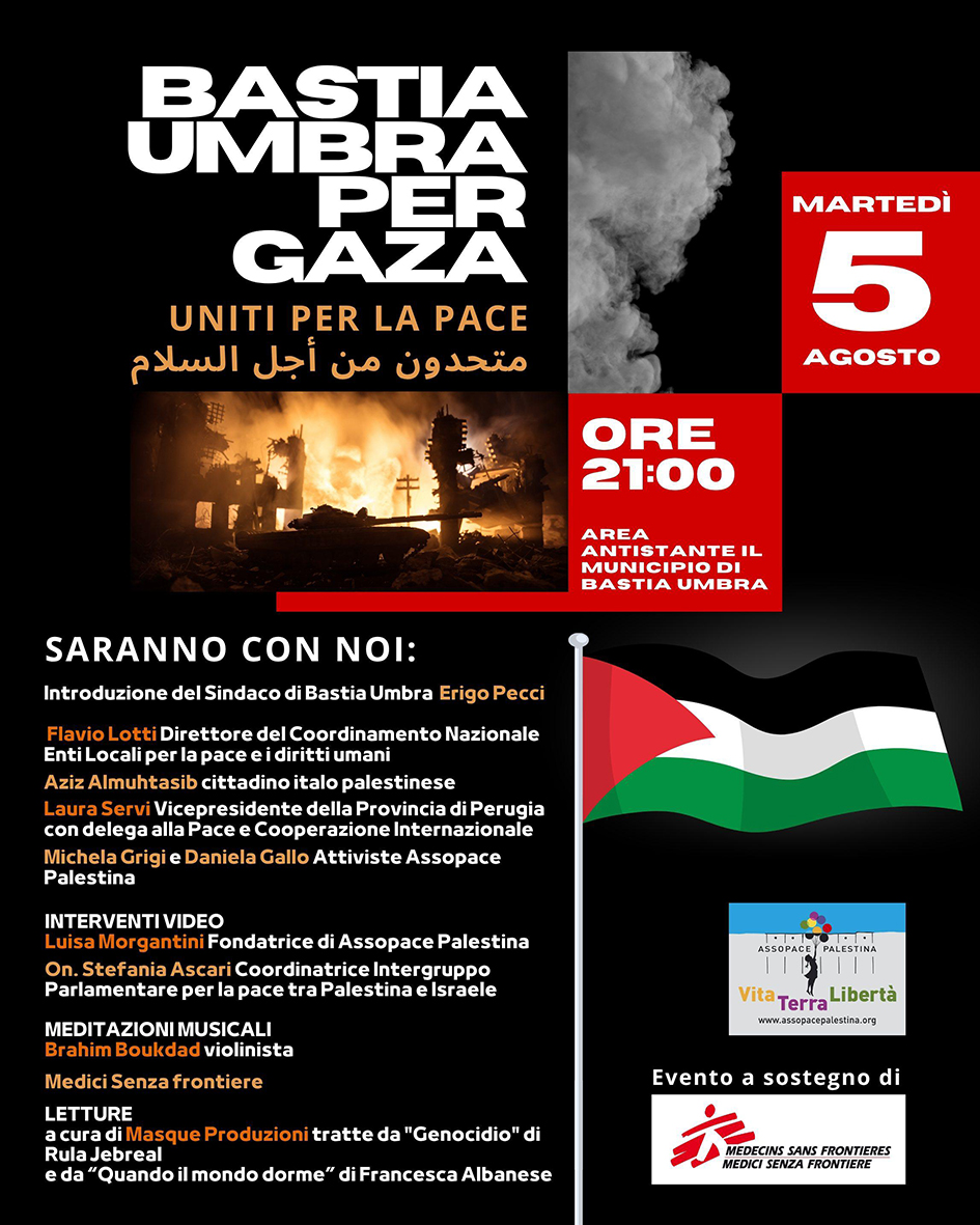 A Bastia Umbra vogliamo dedicare una serata per riflettere su tutto ciò e, domani martedì 5 agosto alle ore 21:00 nell’area antistante il municipio, avremo un’iniziativa di sensibilizzazione sulla gravissima situazione palestinese, dove la popolazione civile continua ad essere vittima di attacchi quotidiani e non ha accesso ad acqua e cibo, e sul silenzio dei governi nazionali e dell’Unione europea.