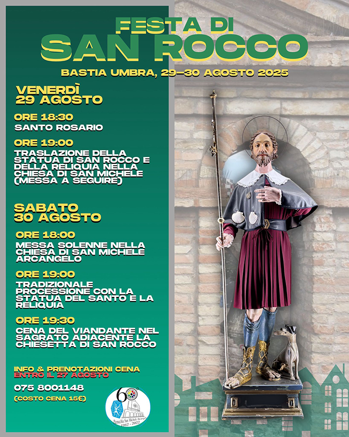 Bastia Umbra, 18/08/2025 – Bastia Umbra si prepara a celebrare la festa in onore di San Rocco, protettore delle malattie infettive e della comunità. Sabato 30 agosto, l’intero paese vivrà una giornata ricca di emozioni, tra momenti di preghiera, tradizioni secolari e una cena conviviale per tutti i cittadini.