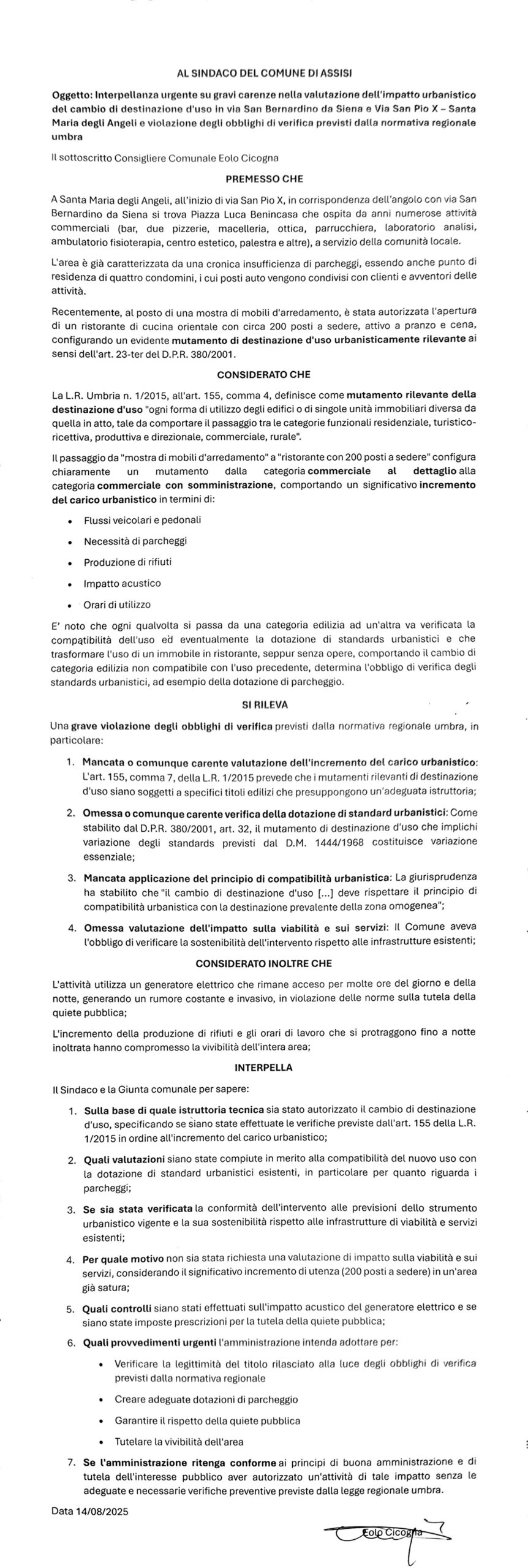 Interpellanza su carenze valutazione impatto urbanistico cambio destinazione d’uso via San Pio X – Santa Maria degli Angeli