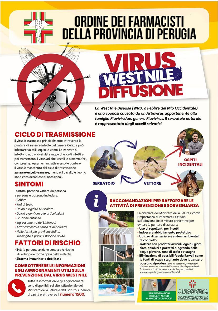 <<Questo caso>>, ha dichiarato il Dr. Filiberto Orlacchio, Presidente dell’Ordine dei Farmacisti della Provincia di Perugia, <<sottolinea l’importanza della formazione professionale, come quella offerta dai corsi dell’Ordine di cui sono Presidente, che consentono di riconoscere tempestivamente i sintomi del West Nile Virus, come febbre, rash cutaneo e dolori muscolari, e di orientare i cittadini verso il corretto percorso diagnostico. Invito la popolazione a seguire le indicazioni del Servizio di Igiene e Sanità Pubblica regionale e a rivolgersi al proprio farmacista di fiducia, figura chiave per informazioni e supporto nella prevenzione e gestione della malattia>>.