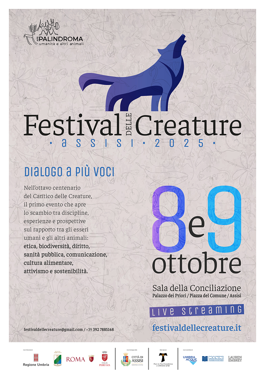 “Questo è un festival coraggioso che vuole aprire uno spazio di dialogo tra chi spesso si trova agli antipodi per formazione, approccio metodologico e visione del mondo – raccontano le organizzatrici del Festival Lorella Muzi, Reisa Perchta e Rebecca Di Santo dell’Associazione Palindroma APS – È proprio da queste differenze, a volte anche forti, che crediamo possano nascere i confronti più fertili e le riflessioni più profonde volte al miglioramento del benessere degli animali. Il festival, che si ispira alla visione radicale e laica di Francesco d’Assisi, mettendola in dialogo con le sfide scientifiche, etiche e culturali che oggi attraversano il nostro rapporto con gli animali, vuole essere un contenitore che accoglie, sviluppa e armonizza prospettive differenti, con l’obiettivo di generare scelte consapevoli nelle persone oltre che evoluzioni positive nel miglioramento del benessere collettivo.”