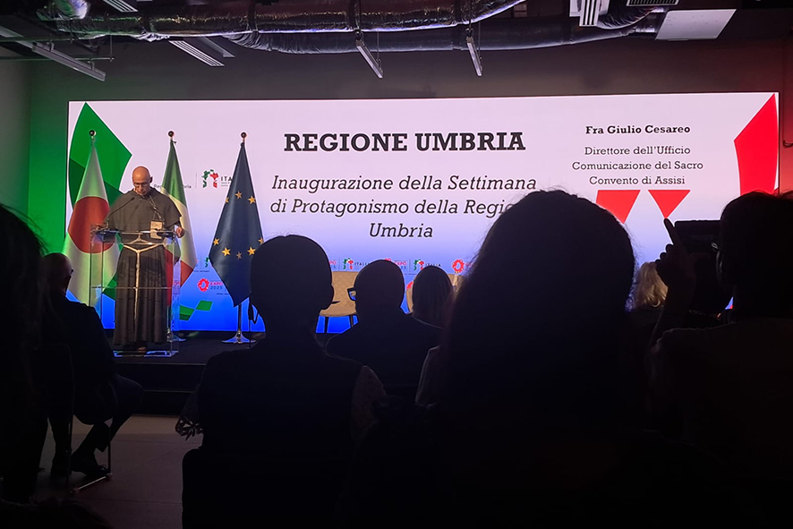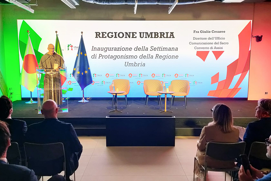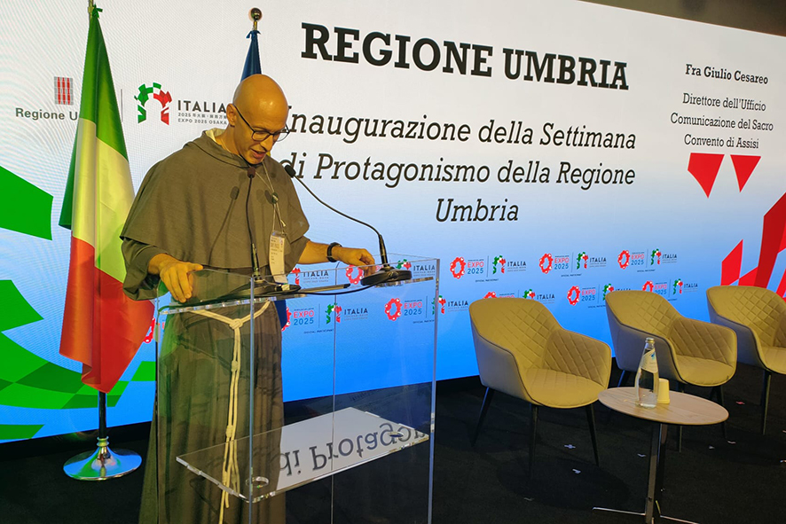 Assisi, 01/09/2025 – In occasione della Settimana di Protagonismo della Regione Umbria, prevista nell’ambito dell’Esposizione Universale di Osaka 2025, la comunità del Sacro Convento è stata invitata a portare un messaggio su san Francesco d’Assisi. A nome dei frati e in rappresentanza di fra Marco Moroni, OFMConv, Custode del Sacro Convento, fra Giulio Cesareo, OFMConv, ha preso la parola nel Padiglione Italia dell’EXPO il 31 agosto al mattino. Il suo intervento (dal titolo “Francesco d’Assisi: Un’ispirazione senza tempo per la famiglia umana”) ha riguardato l’originalità del contributo che san Francesco ha offerto all’umanità nel suo complesso – tenuto conto della sua fama anche al di fuori del contesto italiano e cattolico – rispetto al “tipico” approccio occidentale, che ha assunto e assume spesso toni dominatori. Nel caso di san Francesco, invece, il suo vero contributo transculturale e interreligioso si muove proprio nell’ottica della promozione umile della fraternità, secondo quello stile che da lui prende il nome di “minore”: rinuncia a ogni forma di violenza o esercizio indebito del potere, accoglienza incondizionata dell’altro e servizio umile sulla base dei bisogni altrui in stile di vera fraternità.