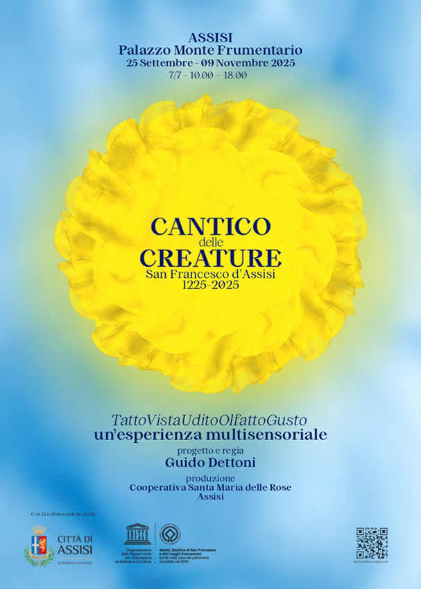 La mostra Cantico delle Creature che si terrà dal 25 di settembre fino la 9 di novembre del 2025 presso il palazzo Monte Frumentario di Assisi condividerà con il più vasto pubblico possibile il Cantico delle Creature, trasmutato in una esperienza multisensoriale (tattile, visiva, uditiva, olfattiva e gustativa), partendo dall’azione artistica collettiva del laboratorio realizzato nel 20024.