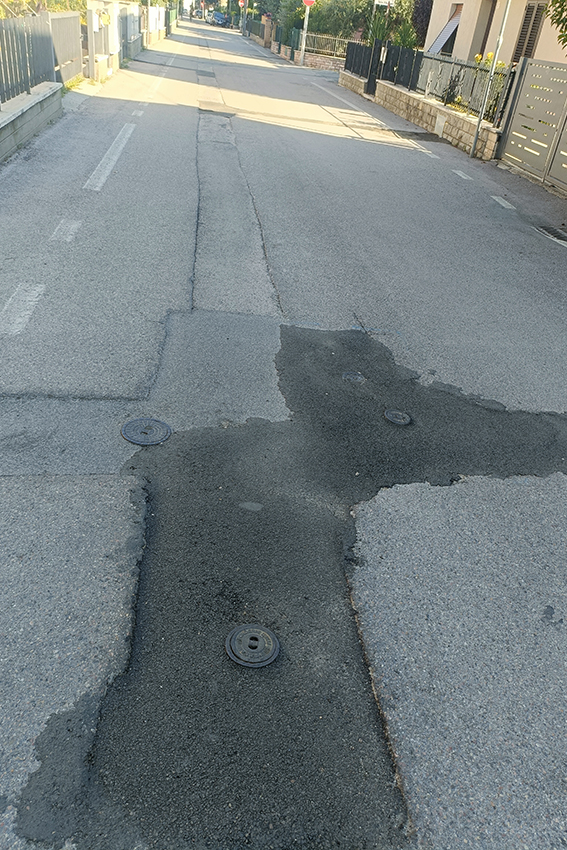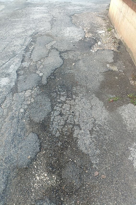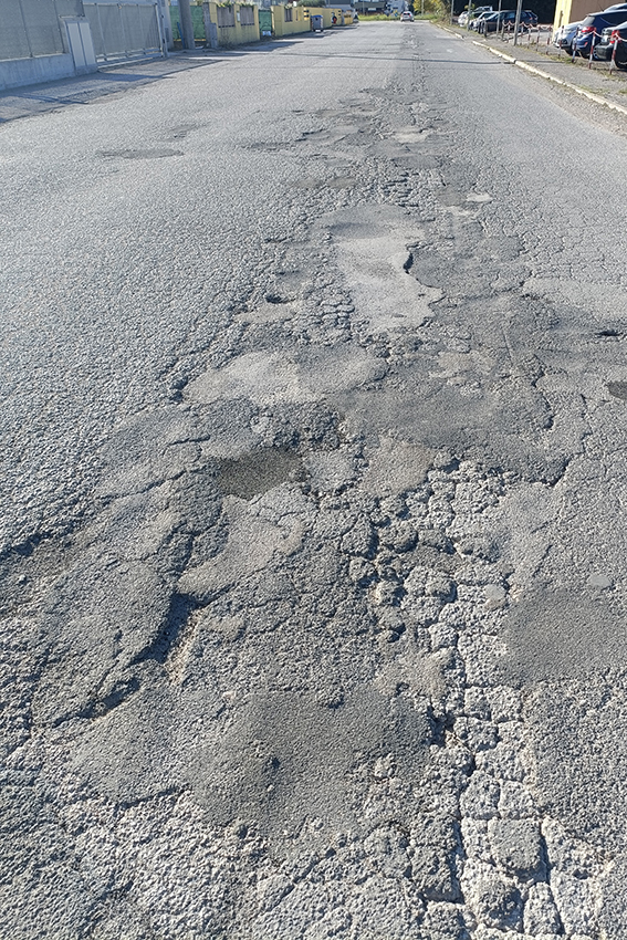 Particolarmente critica è anche la condizione di Via dei Vetturali, nella zona industriale di Santa Maria degli Angeli, ridotta a un colabrodo e resa quasi impraticabile da buche profonde e manto stradale deteriorato, con marciapiedi sconnessi ed erba alta.