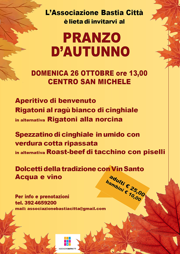 Bastia Umbra, 06/10/2025 – Un momento d’incontro legato ai sapori, ai colori, ai prodotti tipici autunnali dove viene valorizzata la selvaggina e altri preziosi ingredienti stagionali. Un’occasione per ritrovarci, l’Associazione ABC si muove nel territorio per il conseguimento di un fine comune, la convivialità e il piacere di stare insieme. Contiamo sulla vostra presenza, offrendo oltre a buon cibo nostrano un pranzo in allegria, con un menù semplice ma dal gusto autunnale. La prima portata, rigatoni al ragù bianco di cinghiale e il secondo, spezzatino di cinghiale in umido con verdura cotta ripassata.