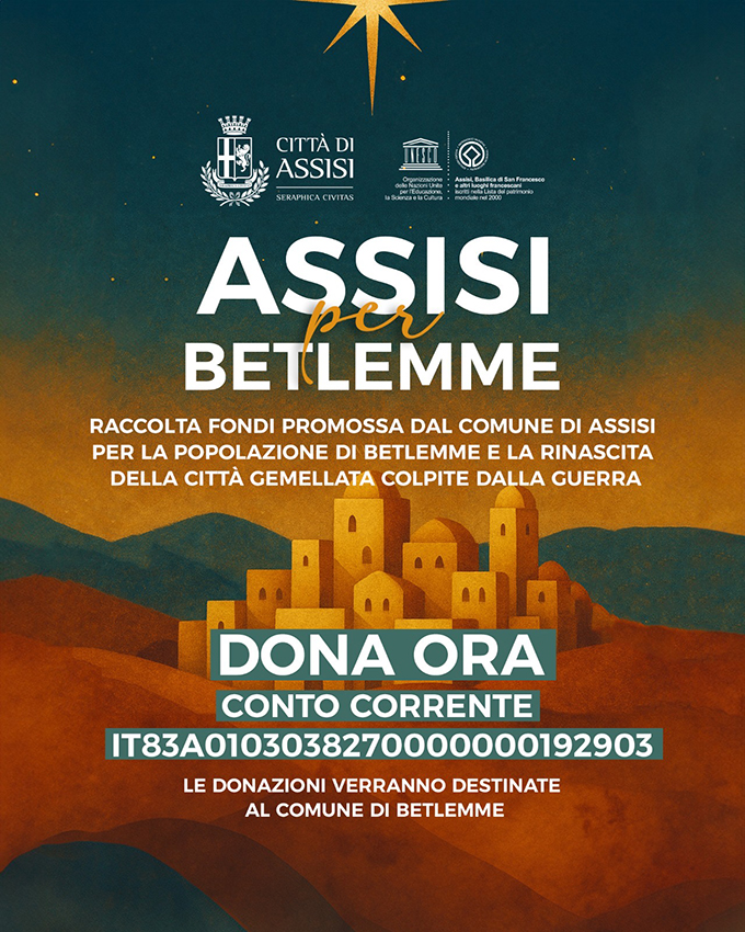 Assisi, 18/10/2025 – Il Comune di Assisi ha promosso una raccolta fondi a favore della popolazione di Betlemme, città gemellata dal 1989, che sta vivendo un momento difficile a causa degli effetti della guerra. È stato attivato un conto corrente, dove tutti possono fare donazioni per aiutare chi soffre e contribuire alla ripartenza: IT83A0103038270000000192903.