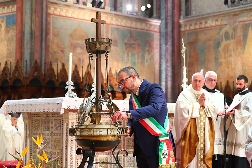 «Nei giorni scorsi il Parlamento ha approvato la legge che rende il 4 ottobre festa nazionale – ha dichiarato il Custode del Sacro Convento fra Marco Moroni, OFMConv, all’inizio della celebrazione in Basilica –: non solo un omaggio al Patrono d’Italia, ma il riconoscimento di valori che parlano a tutti. Perché questa festa diventi davvero feconda, occorre che ciascuno ne tragga conseguenze concrete: le nostre comunità con il loro vivere quotidiano; le amministrazioni locali con le loro scelte di giustizia e di inclusione; il Parlamento e il Governo con leggi e politiche coerenti con ciò che oggi si proclama; ciascuno di noi con scelte di vita sobrie e fraterne.