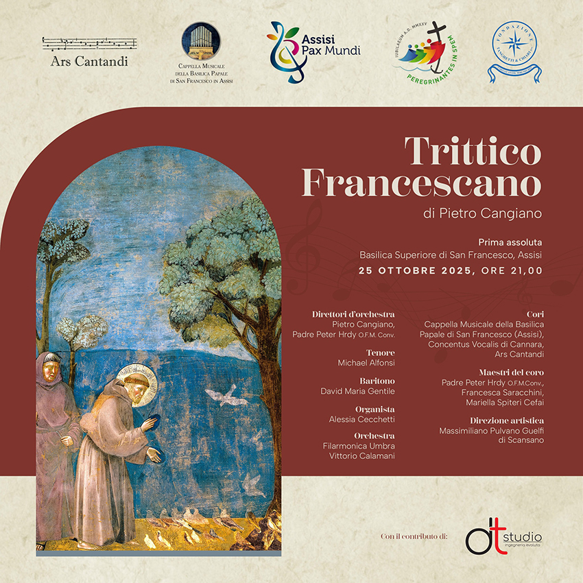 “Coda” della manifestazione sarà, nella data ‘extra’ di sabato 25 ottobre 2025, alle ore 21 nella chiesa superiore della Basilica di San Francesco, la prima mondiale assoluta del “Trittico Francescano”, diretta da p. Peter Hrdy, OFMConv, direttore della Cappella Musicale della Basilica Papale di San Francesco, e dal M° Pietro Cangiano e realizzata in collaborazione con Ars Cantandi e la Fondazione Tanghetti e Chiari e.t.s. e con la partecipazione della Cappella Musicale della Basilica Papale di San Francesco, del Coro Concentus Vocalis di Cannara e dell’Orchestra Filarmonica Umbra V. Calamani. Si tratta di “un viaggio spirituale e sentimentale incentrato su San Francesco di Assisi e sulle due figure femminili (Santa Chiara e Jacopa de’ Settesoli, ndr) che, per prime, hanno abbracciato e condiviso la sua regola e i suoi insegnamenti e che sono state testimoni fedeli e consapevoli della nascita e dello sviluppo del grande rinnovamento spirituale in atto”. L’ingresso è libero.