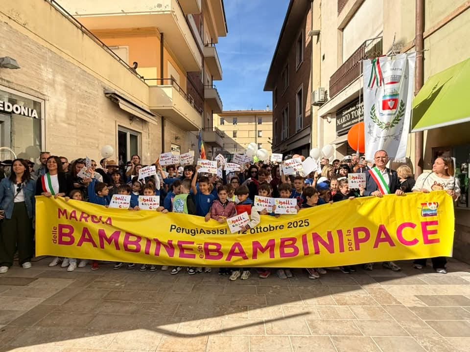 Una mattinata piena di luce e di voci festose ha trasformato piazza Mazzini in un grande abbraccio di colori. Da qui è partita la Marcia della Pace delle bambine e dei bambini, una novità di questa edizione della PerugiAssisi che ha scelto Bastia Umbra come punto di partenza. La piazza era gremita: centinaia di bambini, genitori, insegnanti e volontari si sono ritrovati per dire, con la semplicità dei loro passi, che la pace è un cammino che si impara da piccoli. Forse non erano duemila, ma la partecipazione è stata comunque straordinaria, tanto da porre Bastia al centro dell’attenzione regionale e nazionale.