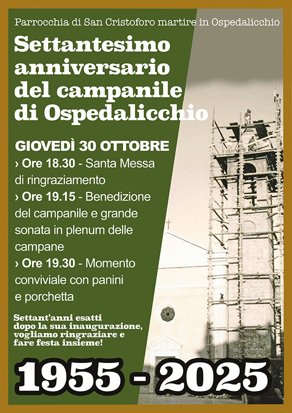 Bastia Umbra, 27/10/2025 – Giovedì 30 ottobre 2025 la comunità parrocchiale di San Cristoforo Martire in Ospedalicchio celebrerà i settanta anni dalla costruzione del proprio campanile, inaugurato esattamente il 30 ottobre 1955. Un anniversario che unisce memoria, gratitudine e orgoglio per un’opera divenuta nel tempo simbolo identitario del paese.