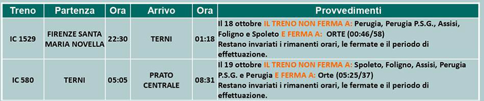 I treni Regionali delle relazioni Roma–Perugia, Foligno–Firenze, Foligno–Perugia/Terontola subiranno cancellazioni e/o limitazioni di percorso. Al fine di garantire la continuità del servizio e limitare l’impatto dei lavori sul territorio, Regionale di Trenitalia (Gruppo FS) ha previsto corse con bus nella tratta Assisi-Foligno. Inoltre, i treni Intercity IC 1529 e IC 580 subiranno variazioni di percorso ed è previsto servizio bus nella tratta Spoleto-Terontola.