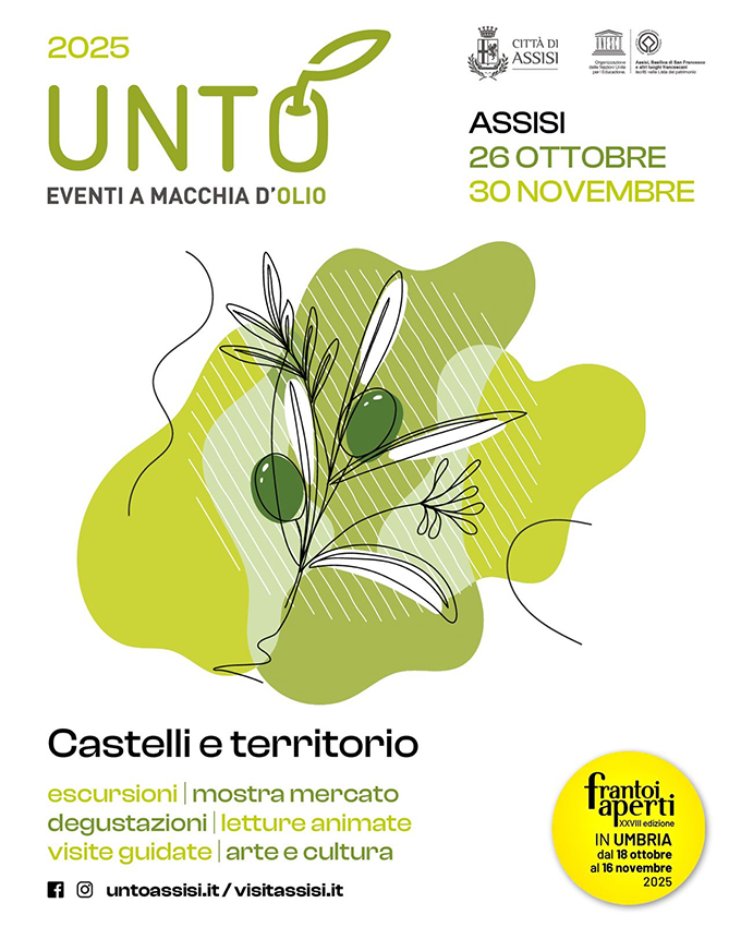Assisi, 23/10/2025 – È tutto pronto ad Assisi per la tredicesima edizione di UNTO (Unesco, Natura, Territorio, Olio), manifestazione dedicata all’olio extravergine di oliva appena franto e alla valorizzazione delle eccellenze del territorio. L’iniziativa – promossa dal Comune di Assisi e in programma dal 26 ottobre al 30 novembre prossimi – è inserita nel cartellone ufficiale di “Frantoi Aperti”, evento nazionale dedicato alla cultura dell’olio di oliva, che porta in Umbria appassionati da tutto il mondo. Tanti gli appuntamenti, fra visite guidate al patrimonio Unesco, degustazioni con esperti del settore, convegni, mostre, trekking e passeggiate culturali, concerti, laboratori, oltre alle immancabili visite gratuite ai frantoi, in cui vivere l’emozione della spremitura e dell’assaggio dell’olio nuovo in bruschetta.