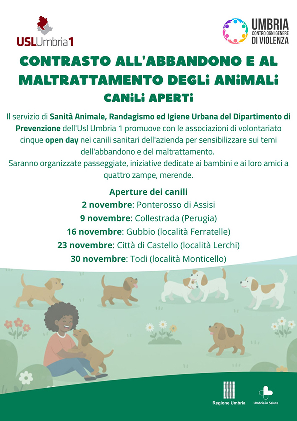Perugia, 31/10/2025 “Canili aperti, l’unico canile bello è quello vuoto”: con questo slogan il servizio di Sanità Animale, Randagismo ed Igiene Urbana del Dipartimento di Prevenzione dell’Usl Umbria 1 ha promosso degli open day, a partire da domenica 2 novembre, nei cinque canili sanitari dell’azienda sanitaria (Collestrada a Perugia, Assisi, Gubbio, Città di Castello e Todi). L’iniziativa punta a sensibilizzare i cittadini sui temi dell’abbandono e del maltrattamento degli animali.