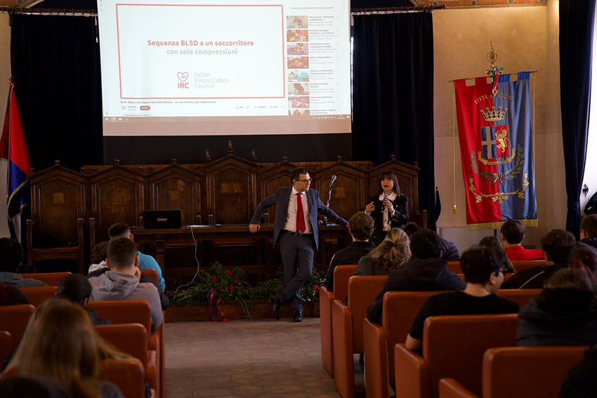 L’incontro, nello specifico, si è focalizzato sulla formazione al primo soccorso e sulla presentazione di tecnologia sanitaria avanzata, consolidando il ruolo del cittadino come primo soccorritore nella cruciale “catena della sopravvivenza”. La mattinata ha visto gli studenti impegnati in una lezione teorica e in intense esercitazioni pratiche sulle manovre di rianimazione cardiopolmonare. Il momento più atteso è stata la simulazione pratica commentata in tempo reale, un’azione dimostrativa che ha ripercorso ogni anello della catena: dall’intervento iniziale dello studente soccorritore, all’arrivo tempestivo dell’équipe del Pronto soccorso con la nuova automedica e la dimostrazione del massaggio cardiaco automatico eseguito con il dispositivo Lucas®. L’iniziativa si è conclusa con la solenne cerimonia di inaugurazione ufficiale della nuova automedica.