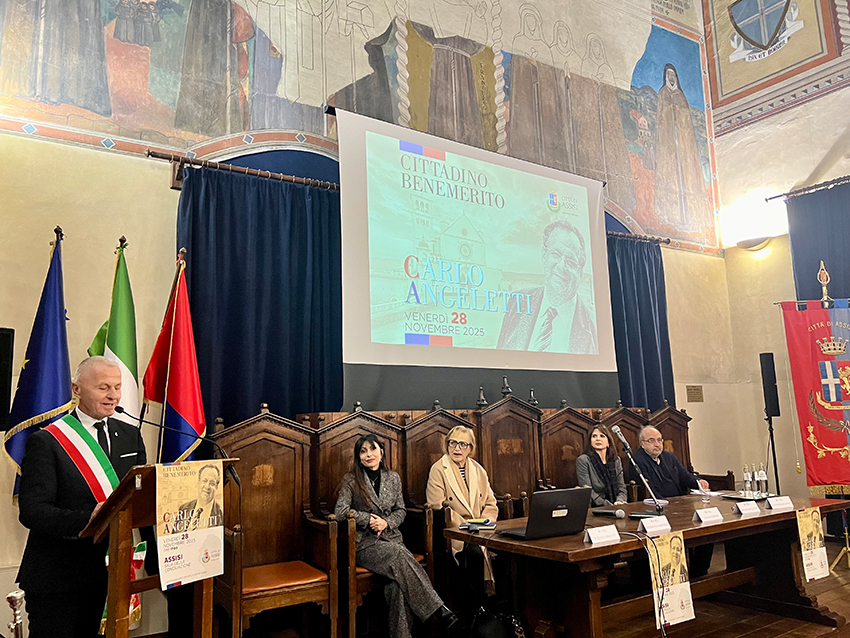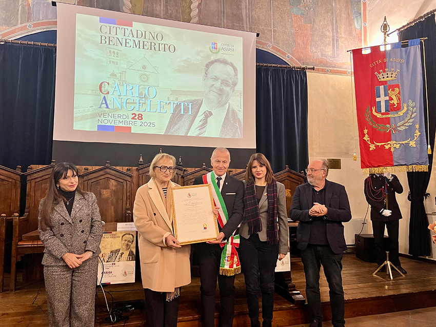 Il riconoscimento – rappresentato da una pergamena con i motivi dello stesso e il sigillo d’oro della città – è stato consegnato alla moglie Antonietta Mancinelli e alla figlia Fulvia Angeletti dal sindaco di Assisi Valter Stoppini, presenti anche la presidente della Regione Umbria Stefania Proietti, la presidente del Consiglio comunale Annalisa Rossi, componenti della Giunta comunale, diversi consiglieri comunali, il custode del Sacro Convento di Assisi fr. Marco Moroni, il giornalista e coordinatore di Articolo 21 Beppe Giulietti, rappresentanti delle forze dell’ordine e del tessuto associativo della città, familiari e amici di Carlo Angeletti.