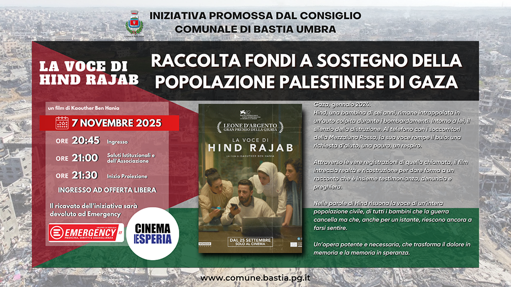 Bastia Umbra, 03/11/2025 – Il Comune di Bastia Umbra, con il sostegno dell’intero Consiglio Comunale, promuove una serata di sensibilizzazione e solidarietà a favore della popolazione palestinese e delle vittime del conflitto a Gaza.